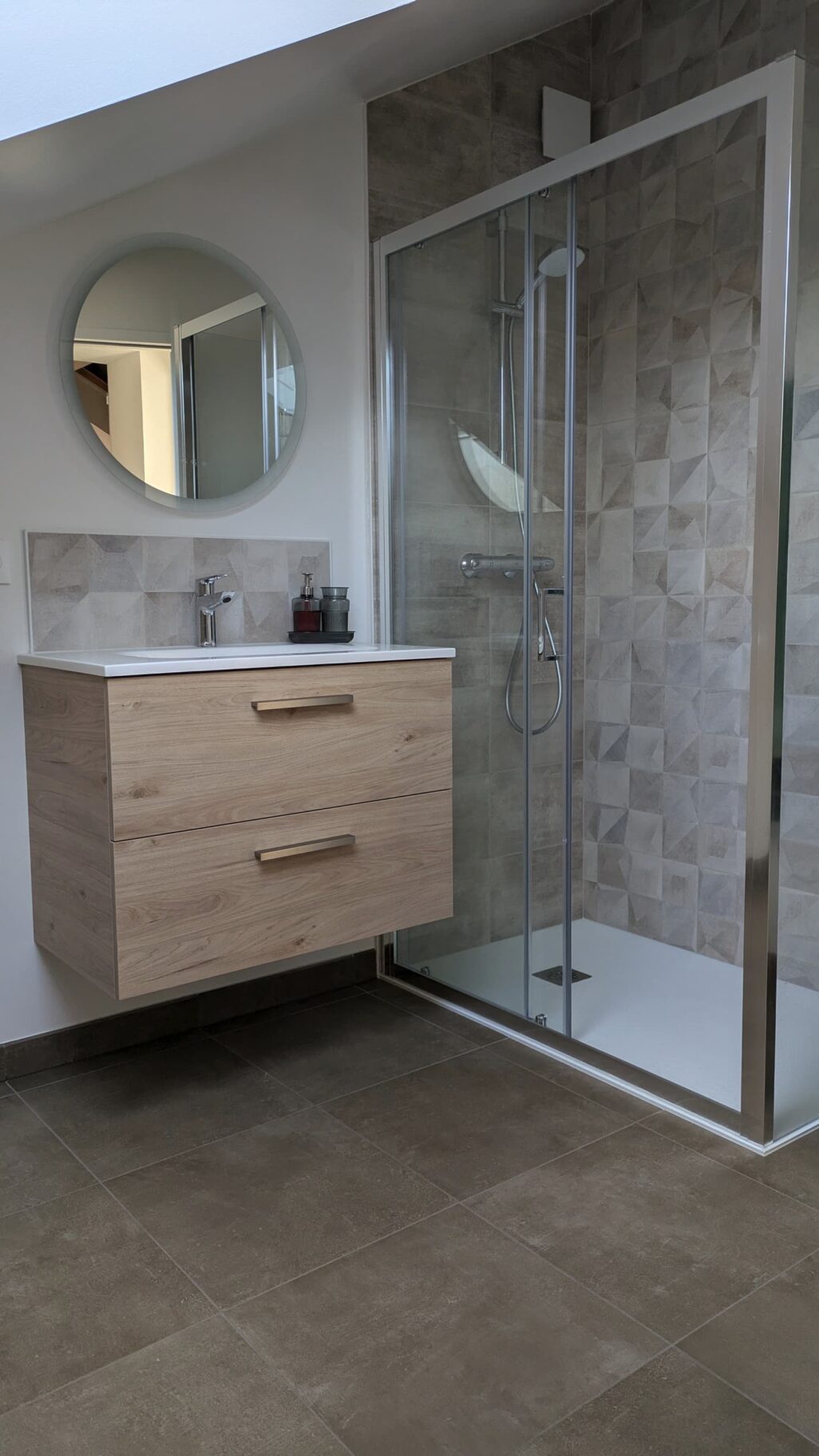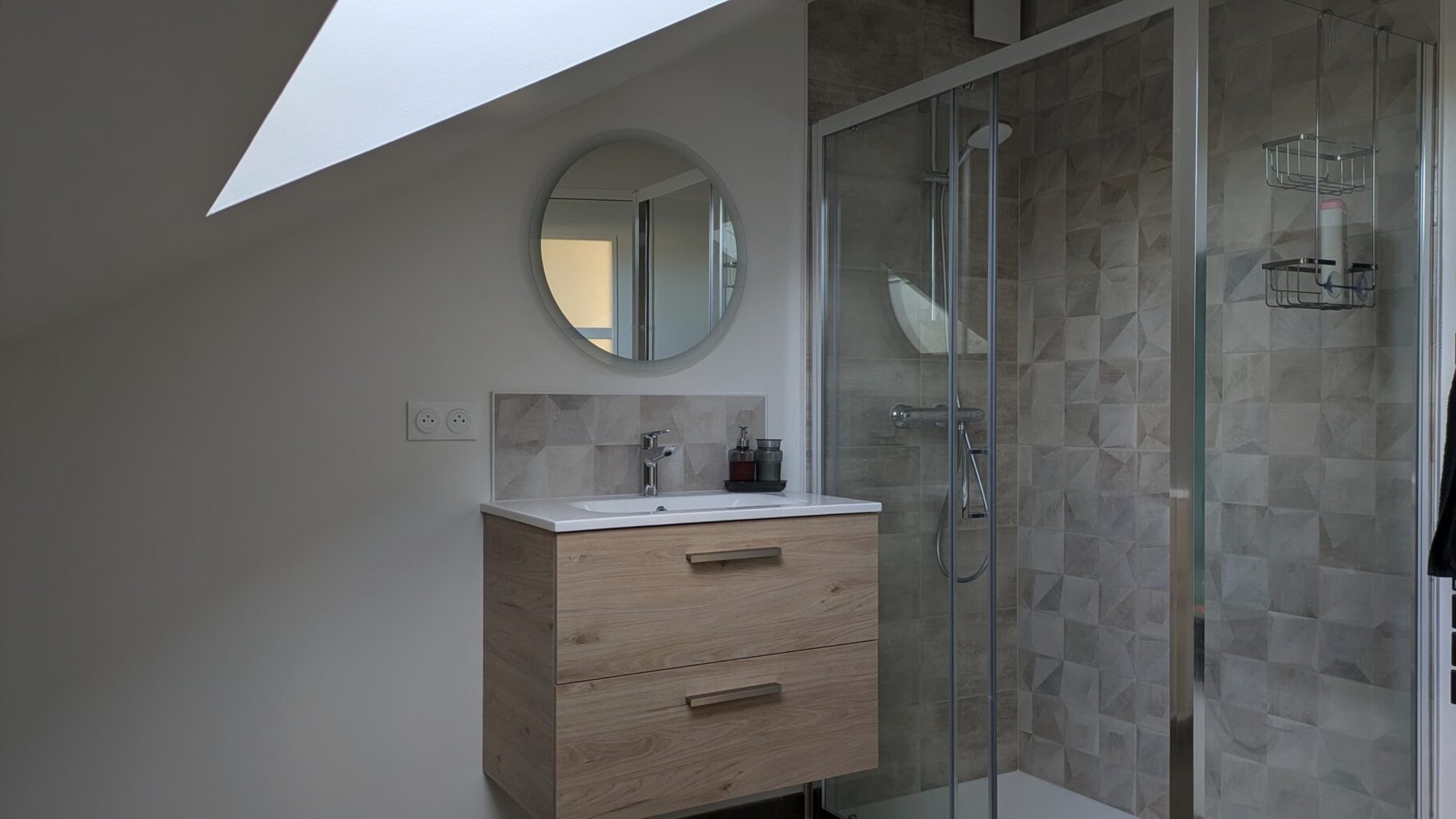 Les travaux ont été réalisés par des corps d’état spécialisés : plaquiste, plombier, menuisier, carreleur et électricien coordonnés par Activ Travaux – Atlantic Déco & Travaux.